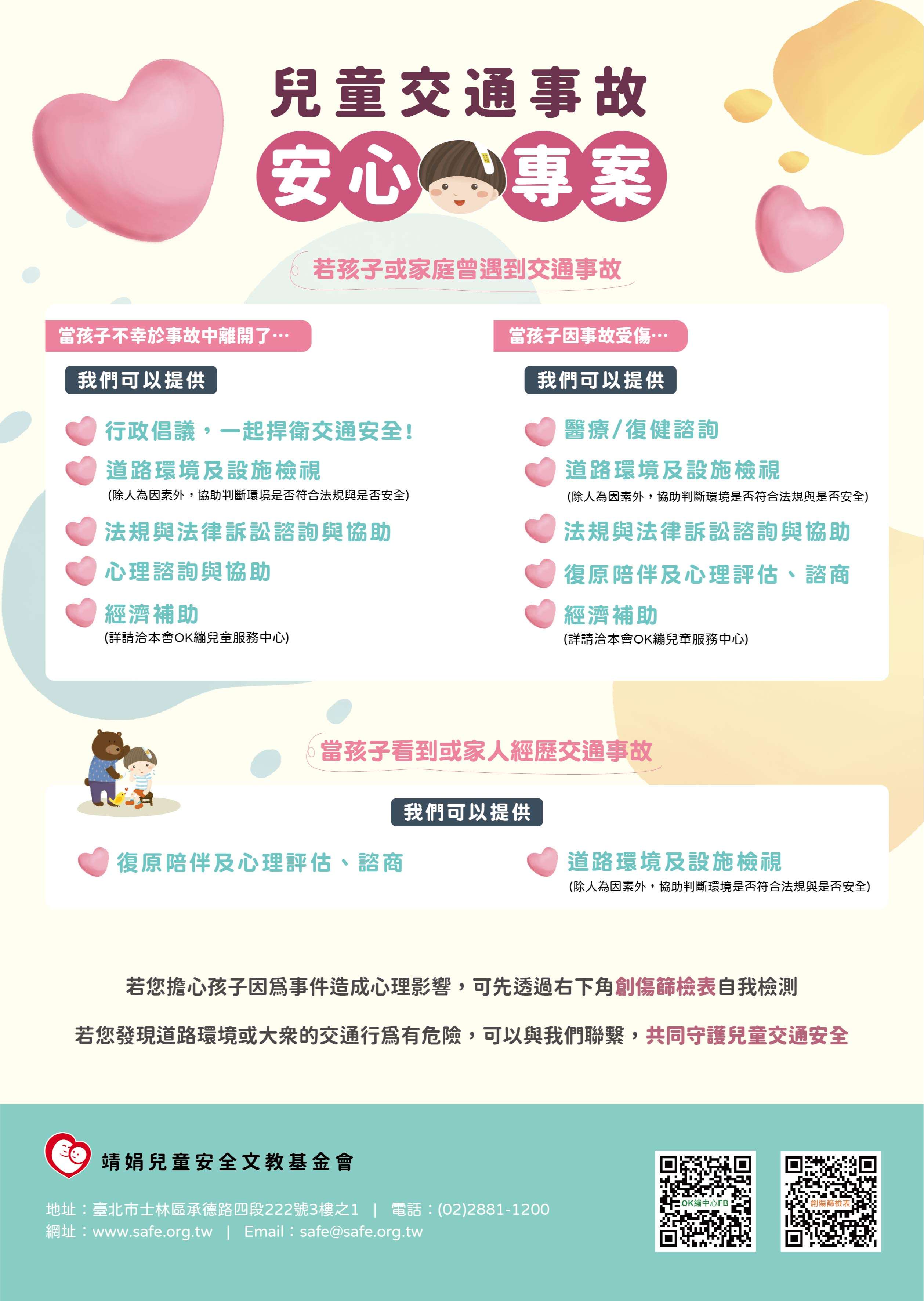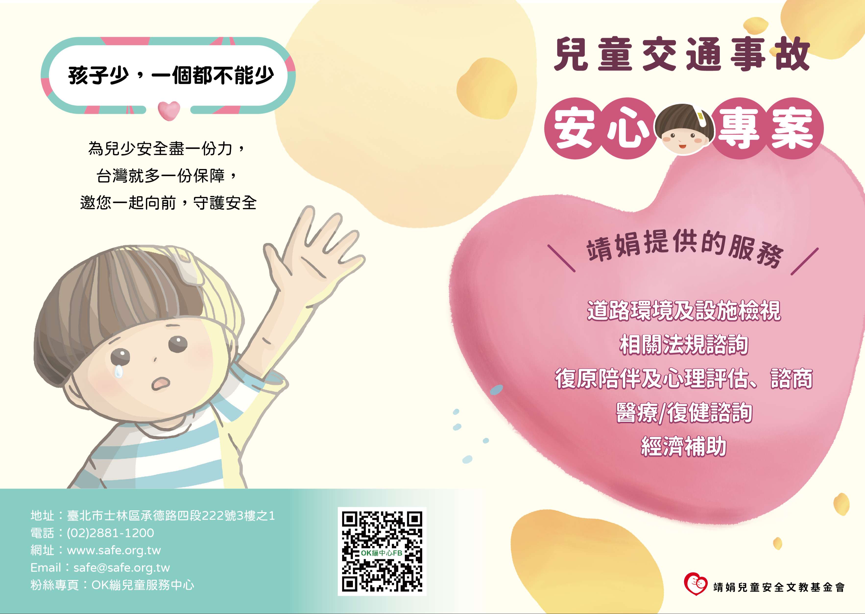 為協助兒少及其家庭面對交通事故後之問題及穩定就學, 靖娟基金會自110年開辦「兒少交通事故安心專案」,以經 歷交通事故之兒少為核心,提供法律、醫療、心理、環境 檢視與行政倡議之服務。檢附「兒少交通事故安心專案」資料、宣傳單張及海報各1 份。