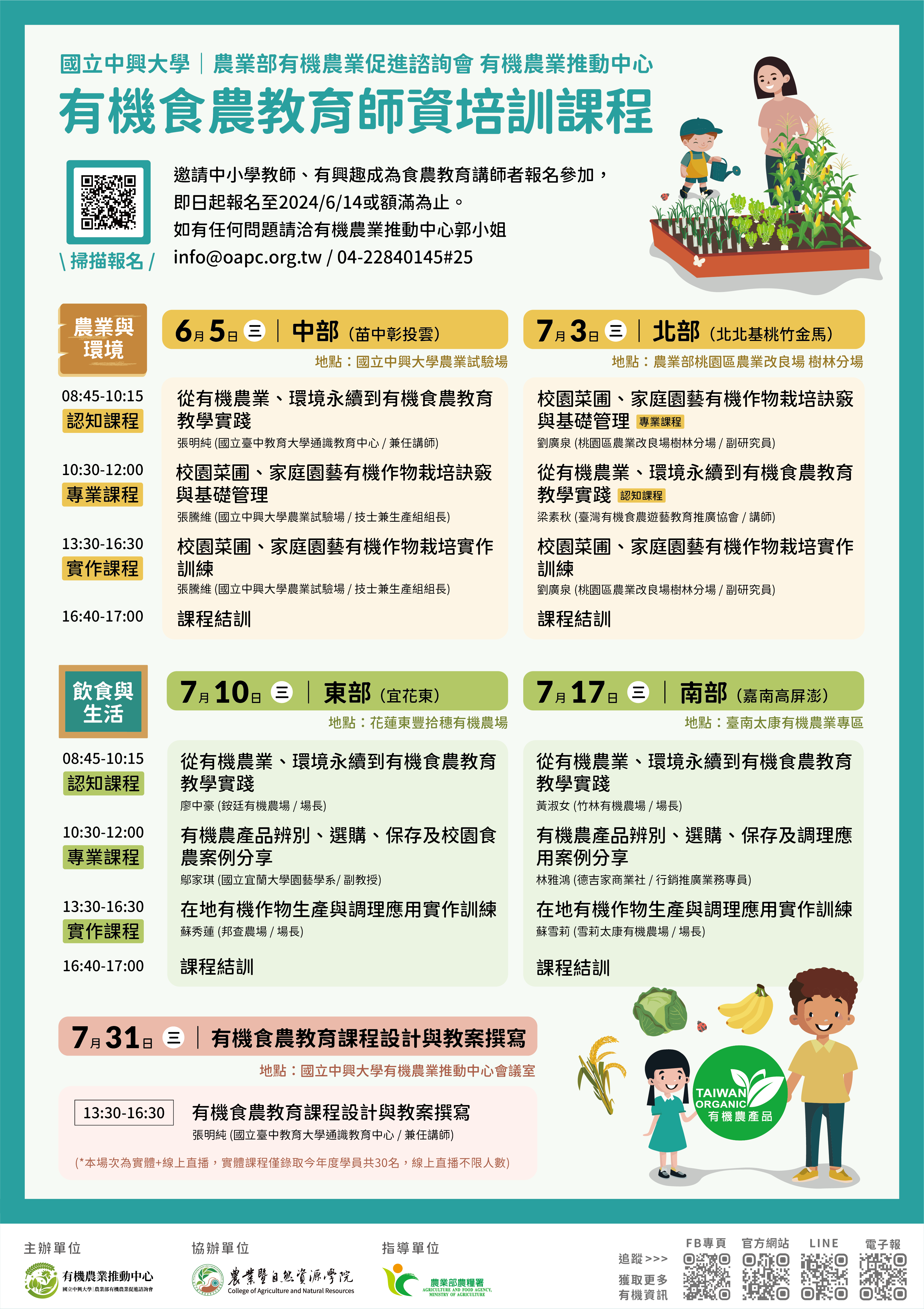 轉知國立中興大學辦理「有機食農教育師資培訓課程」,