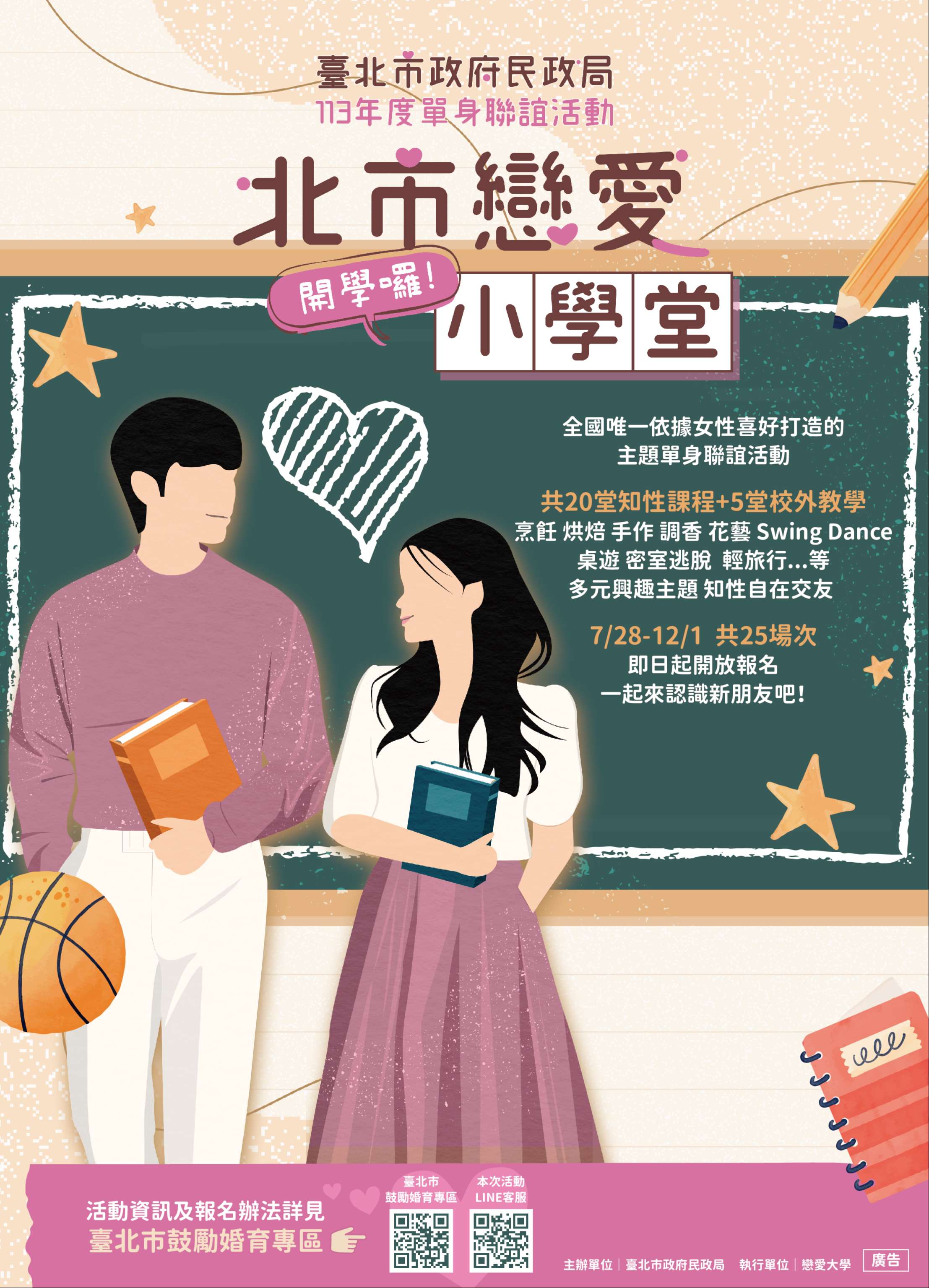 113年臺北市民政局單身聯誼-北市戀愛小學堂開放報名囉!7/28至12/1共25堂多元主題活動,有烹飪、烘焙、手作等活動,歡迎單身朋友報名參加!活動詳情請至「臺北市鼓勵婚育專區」查詢。