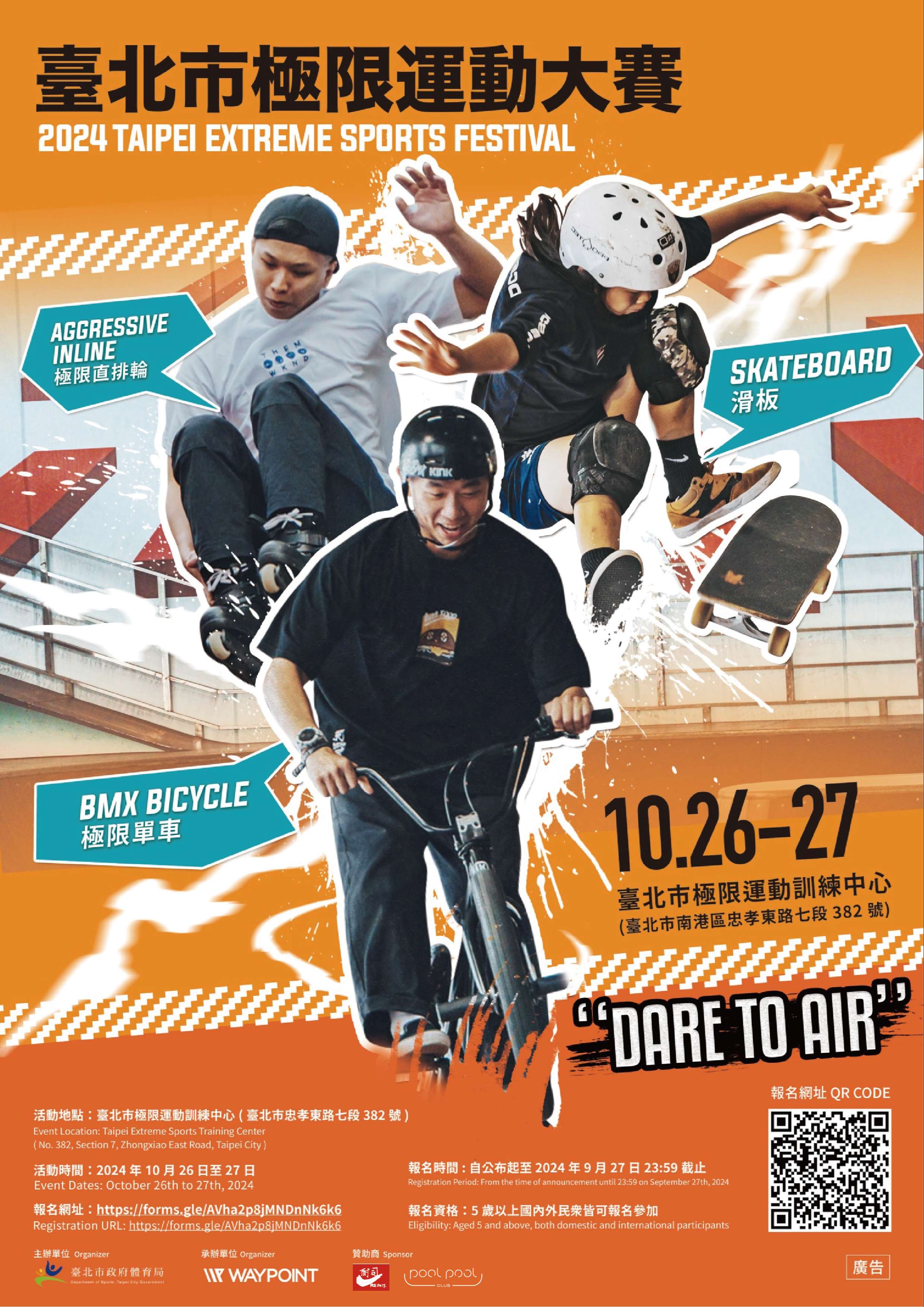 2、30字:2024臺北市極限運動大賽10/26-27舉行,8/16 開放報名,活動資訊詳見簡章。