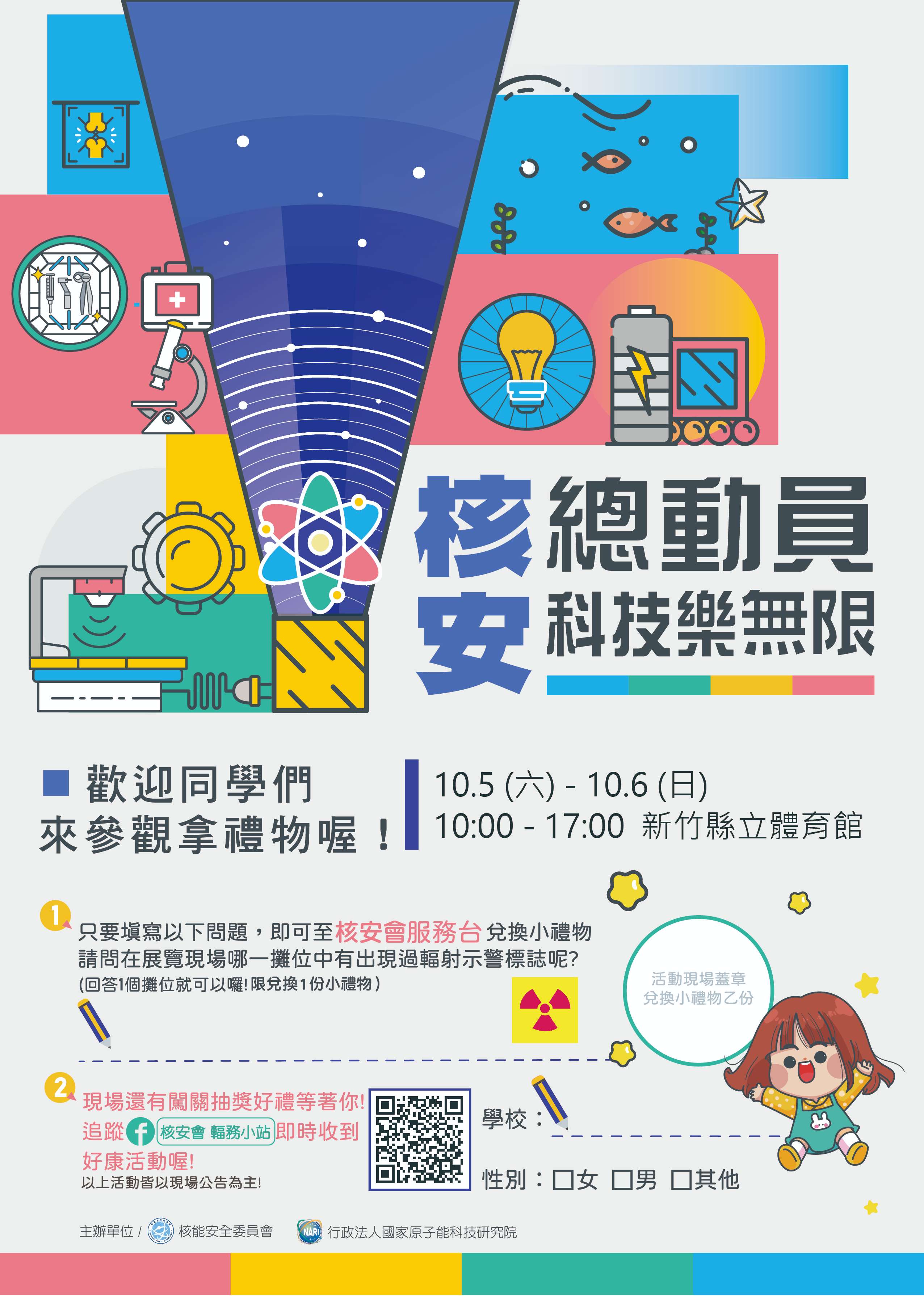 旨揭科普展將透過闖關遊戲以趣味性方式介紹「輻射在 生活中的應用與防護、如何檢測海洋中的氚、核電廠怎麼除役、什麼是核廢料」等內容,現場亦有摸彩活動,請貴校(含國立學校)鼓勵學生踴躍參加。