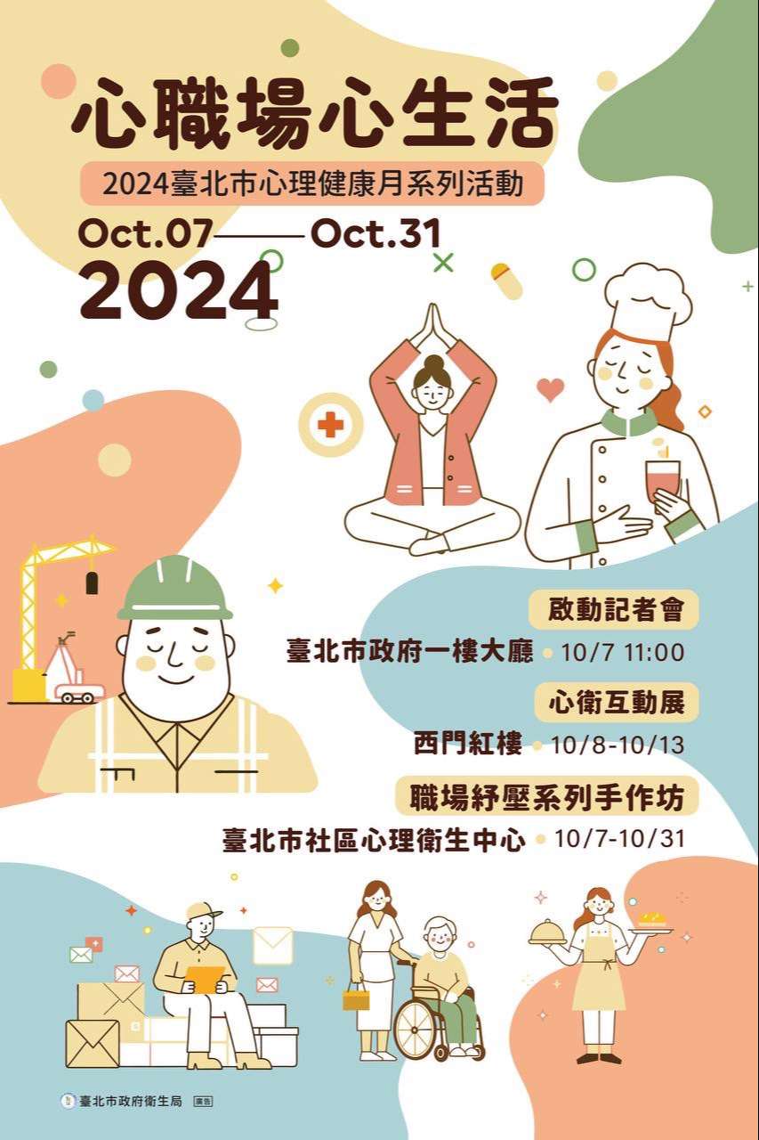 臺北市衛生局今年10月7日開始辦理一系列心理健康活動,幫你辨識是否正待在有毒職場、同時幫你增強自身免疫力、提供「解毒工具」,讓你獲得「心職場 心生活」。