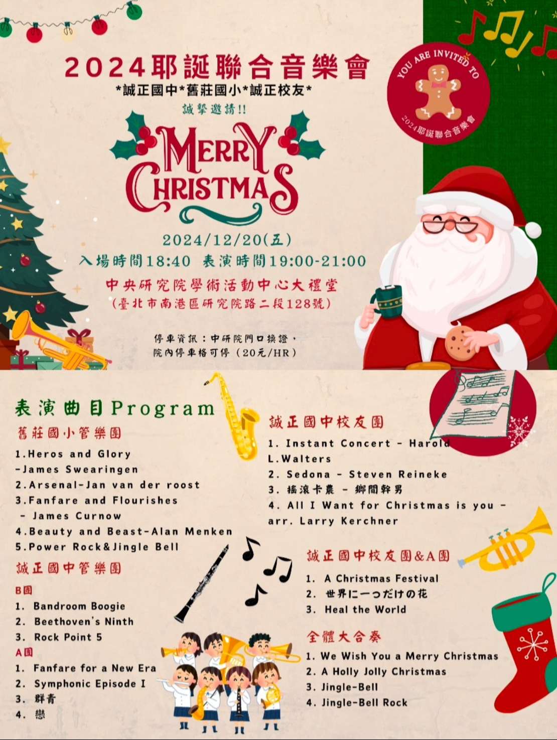 三、本次活動由誠正管樂團聯合舊莊國小管樂團及誠正校友團辦理此次音樂會,在聖誕佳節前夕,用音樂一起交流、用音樂陪伴大家過聖誕佳節。