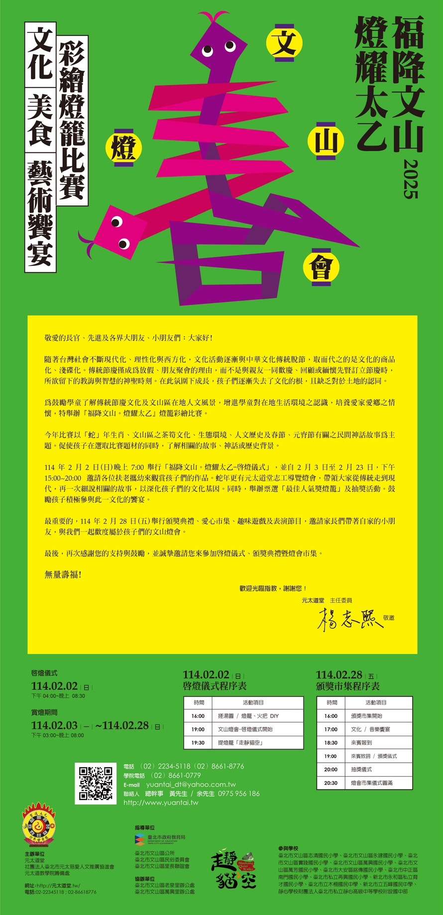 (一)點燈儀式:114年2月2日下午4時至6時,屆時將安排傳統 元宵燈節搓元宵、持火把、走靜貓空等活動。