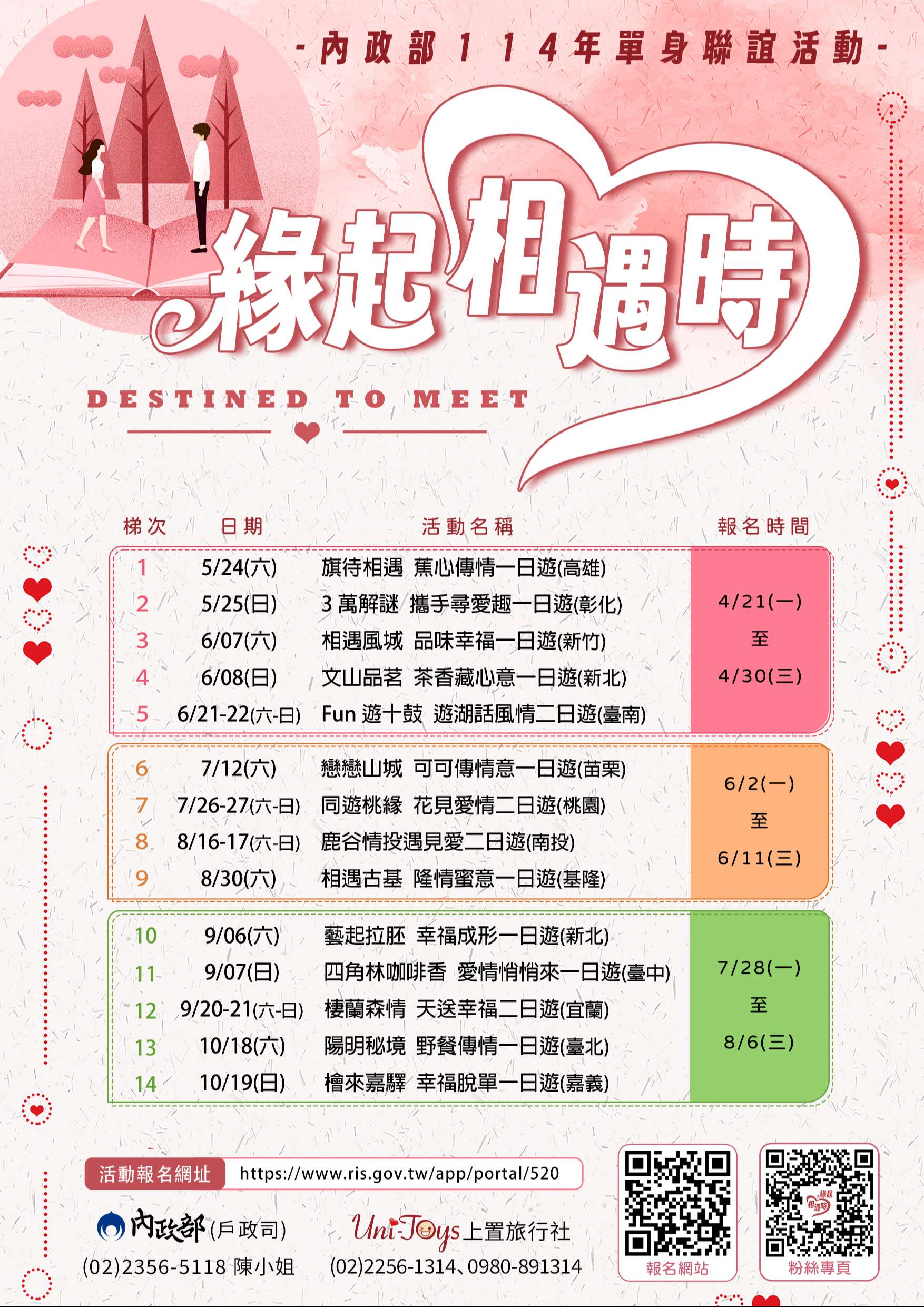 內政部114年「緣起相遇時」單身聯誼活動開跑了,歡迎單身者踴躍報名。活動詳情及報名資訊請參閱內政部戶政司全球資訊網(主題資訊—單身聯誼活動專區)。
