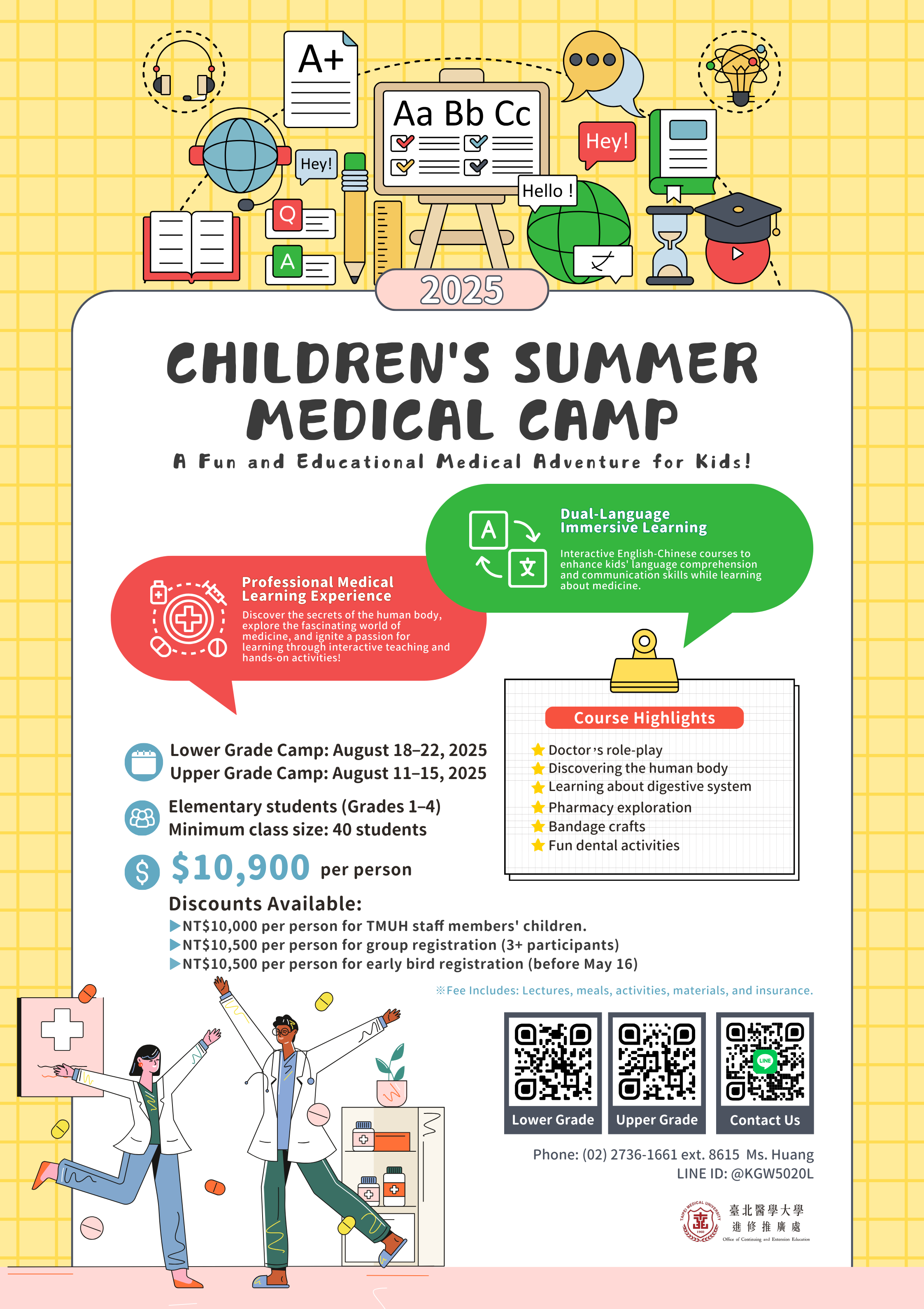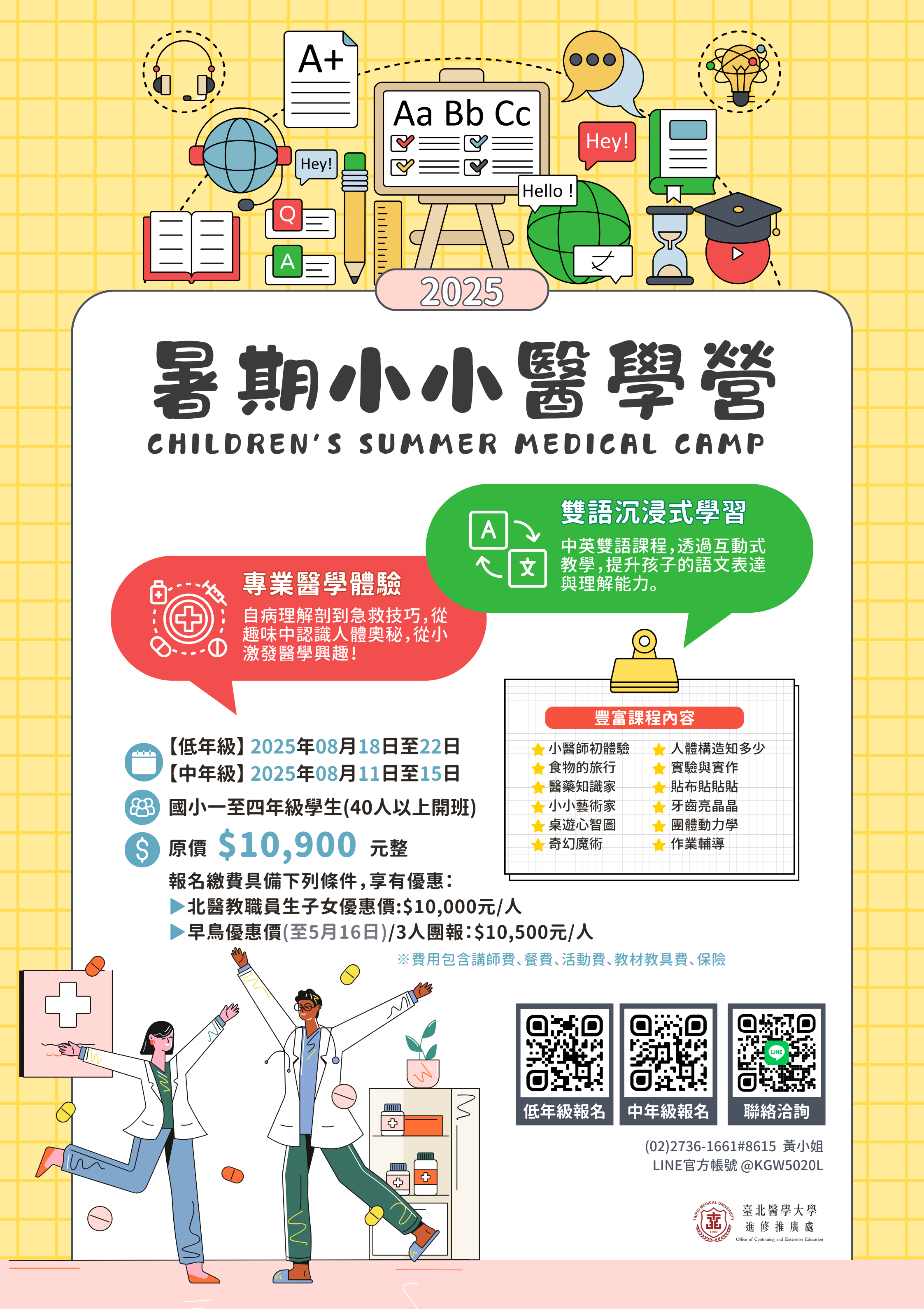 一、【小小醫學雙語營】為提供國小一至四年級學生兼具趣味 與知識的中英雙語醫學入門課程,由臺北醫學大學教師、 附屬醫療機構醫事人員,和專家學者共同授課,透過趣味 遊戲認識人體奧秘、急救技巧、基礎醫學等,從小激發醫 學興趣,課程以中英雙語授課,及互動式教學方式,提升 孩子的語文表達及理解能力。