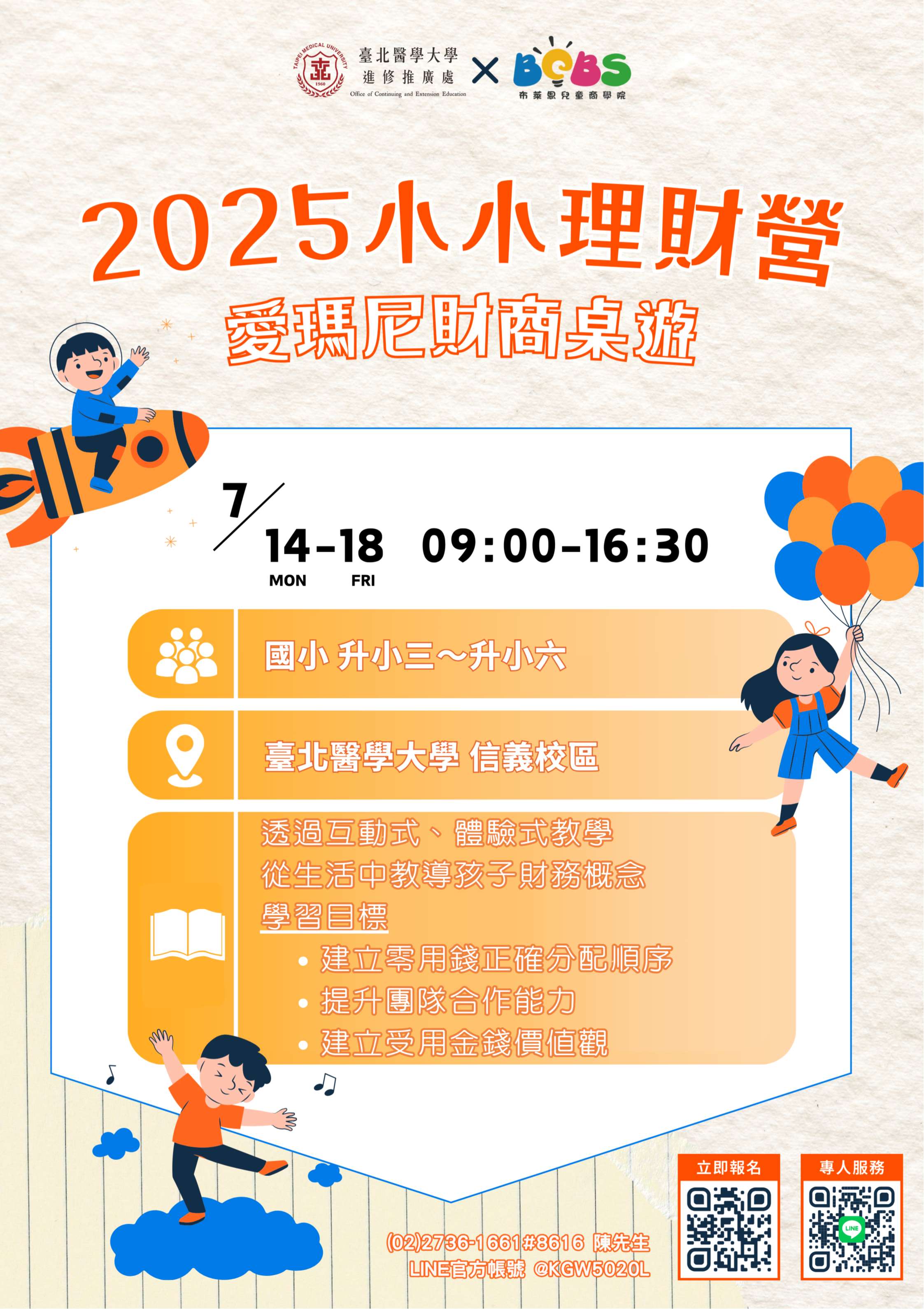 2.低年級專區:https://reurl.cc/AM7E7e (二)小小理財營-愛瑪尼財商桌遊:https://reurl.cc /dQW0x2 (三)國小醫學探索營、醫牙藥學營:https://reurl.cc /nmZ9n1 六、如有營隊問題,歡迎來電洽詢(02)2736-1661 【小小醫學雙語營】分機8615 黃小姐 【小小理財營-愛瑪尼財商桌遊】分機8616 陳先生 【國小醫學探索營、醫牙藥學營】分機8620 陳先生