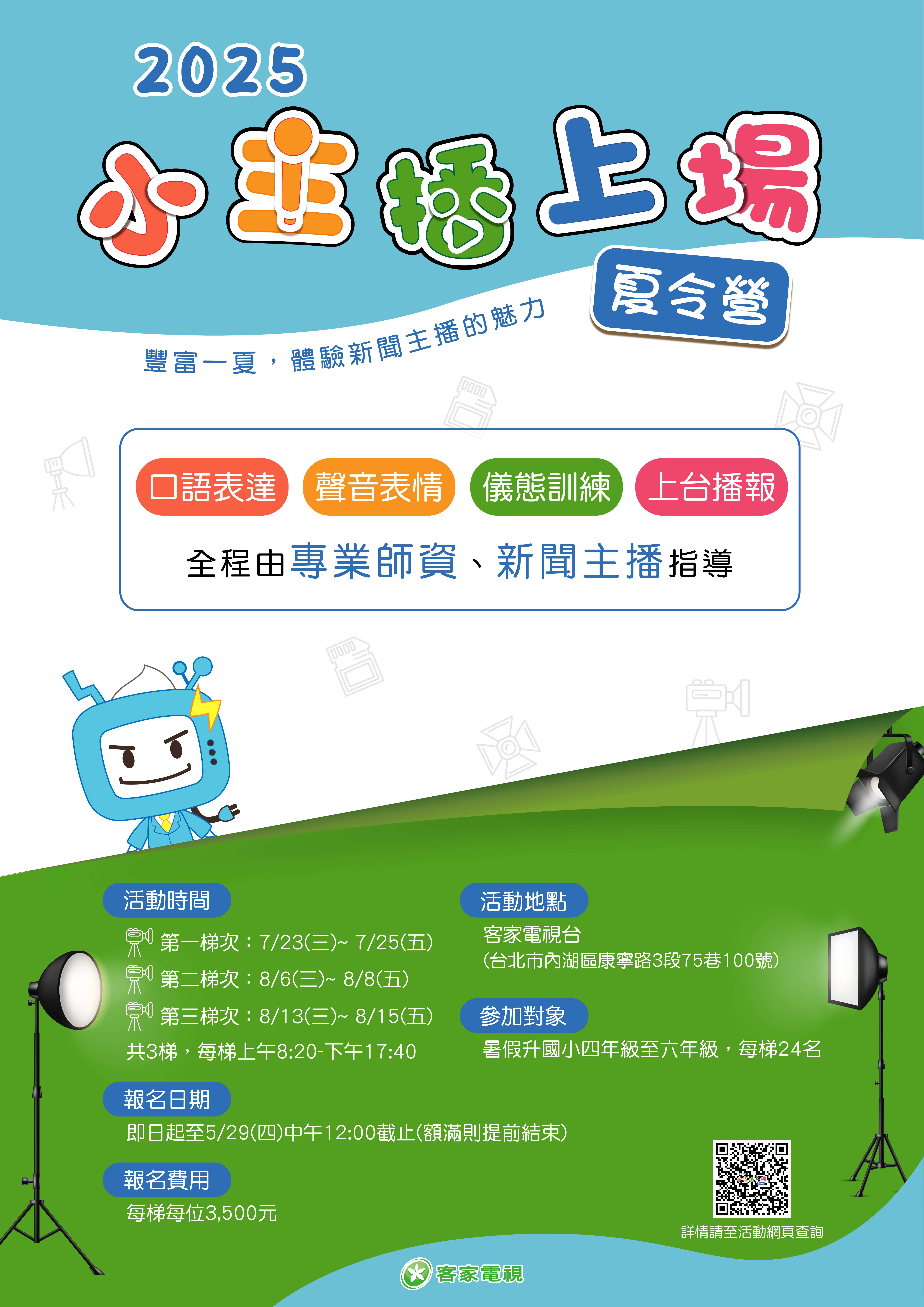 一、為增進學童媒體素養、語言表達能力及團隊合作精神,並 透過分組學習與實際演練,體驗新聞製作及主播播報技 巧,本會客家電視特於暑期舉辦「2025客家電視小主播上 場夏令營」,針對暑期後國小四到六年級學生設計內容, 並邀請專業講師及新聞主播進行授課。 二、本次營隊費用為新臺幣3,500元,每梯次僅招收24位學 生。 (一)第一梯次:2025年7月23日至7月25日 (二)第二梯次:2025年8月6日至8月8日 (三)第三梯次:2025年8月13日至8月15日