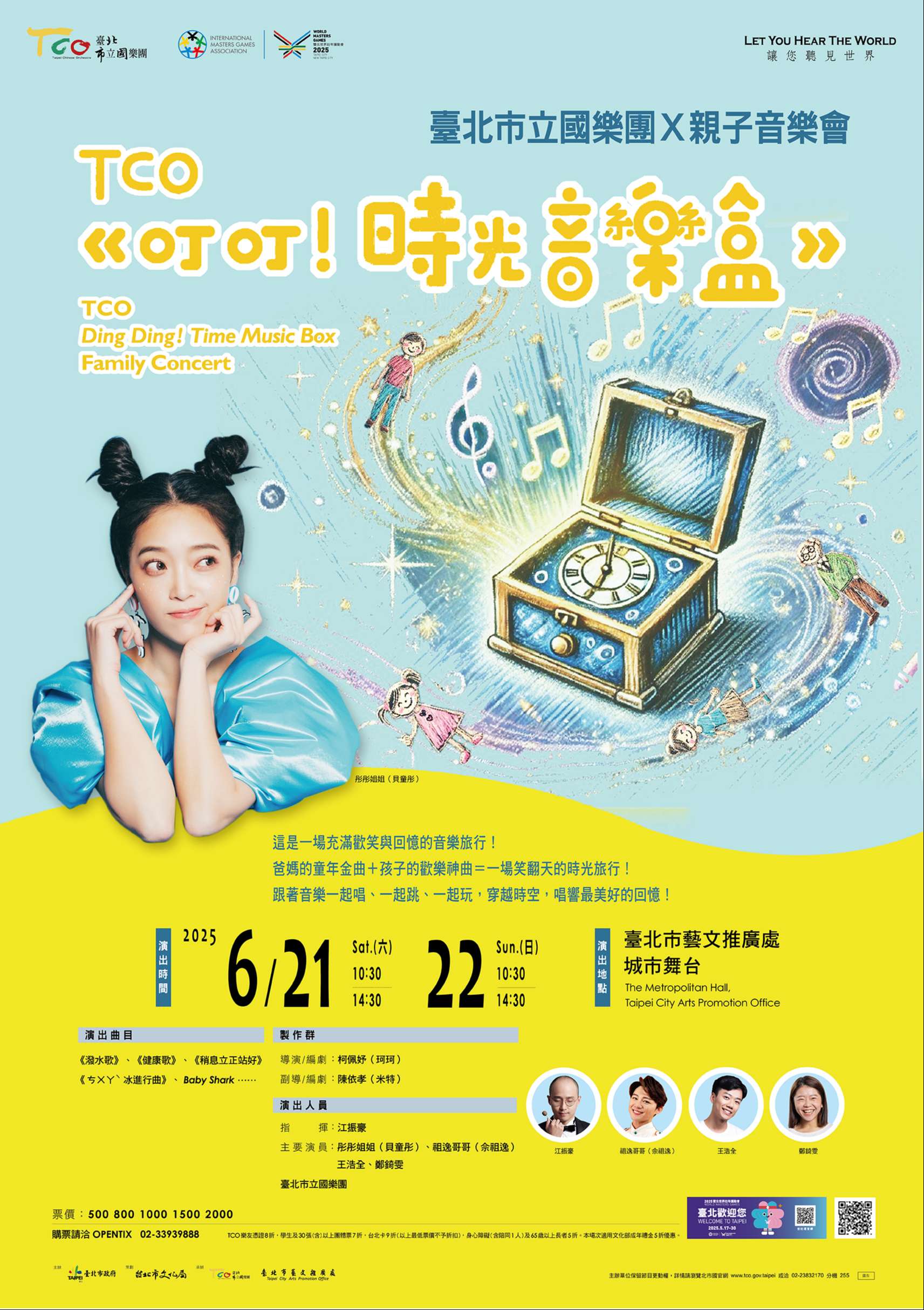 一、臺北市立國樂團(以下簡稱本團)將於114年6月21日、22 日假臺北市藝文推廣處城市舞台演出《叮叮!時光音樂盒》親子音樂會。特別邀請彤彤姐姐、祖逸哥哥等小朋友 喜愛的哥哥姐姐們與國樂團演出,有爸媽熟悉的童年金曲和孩子最愛的快樂神曲,交織出一場跨世代的歡樂派對。 (宣傳海報及DM如附件)