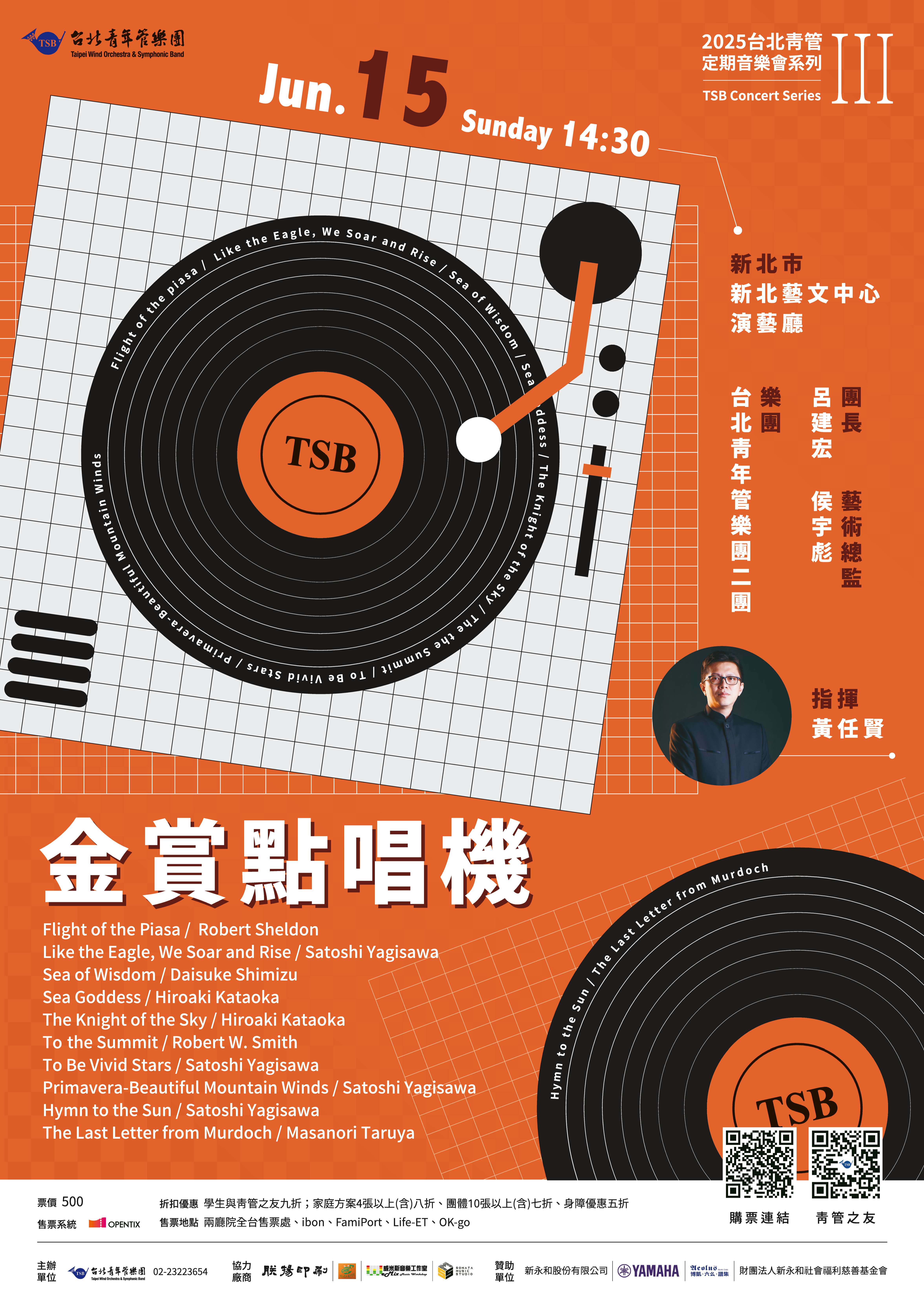 二、旨揭音樂會相關訊息如下: (一)演出時間:114年6月15日 (星期日)下午2點30分 。 (二)演出地點:新北藝文中心演藝廳(新北市板橋區莊敬路 62號)。 (三)購票與折扣優惠查詢請至OPENTIX售票系統 (https://s. opentix.life/p/P76f99eb8);相關問題請逕洽台北青管 樂團經理王先生(02-2322-3654)。 (四)相關音樂會資訊請至台北青年管樂團臉書粉絲專頁查詢 (https://www.facebook.com/tsbgroup/)。三、檢附旨揭音樂會海報供參。