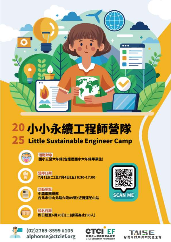 三、活動資訊摘要: 報名資訊:即日起至114年6月20日(五)止 (50人為限,額滿即止),僅接受網路報名,敬請進入活動報名網頁 (https://reurl.cc/Z4vlEp) 報名資格:114學年度國小五、六年級生(含應屆畢業生)。活動時間:2025年7月1日(二)至7月4日(五) (不過夜營隊)。 敬請持續關注本會臉書粉絲專頁(https://www.facebook.com /CTCIEF/ ) 及官網掌握活動消息。 活動洽詢:中鼎教育 基金會林經理,電話:(02)2769-8599 轉105。信箱: alphonse@ctcief.org。