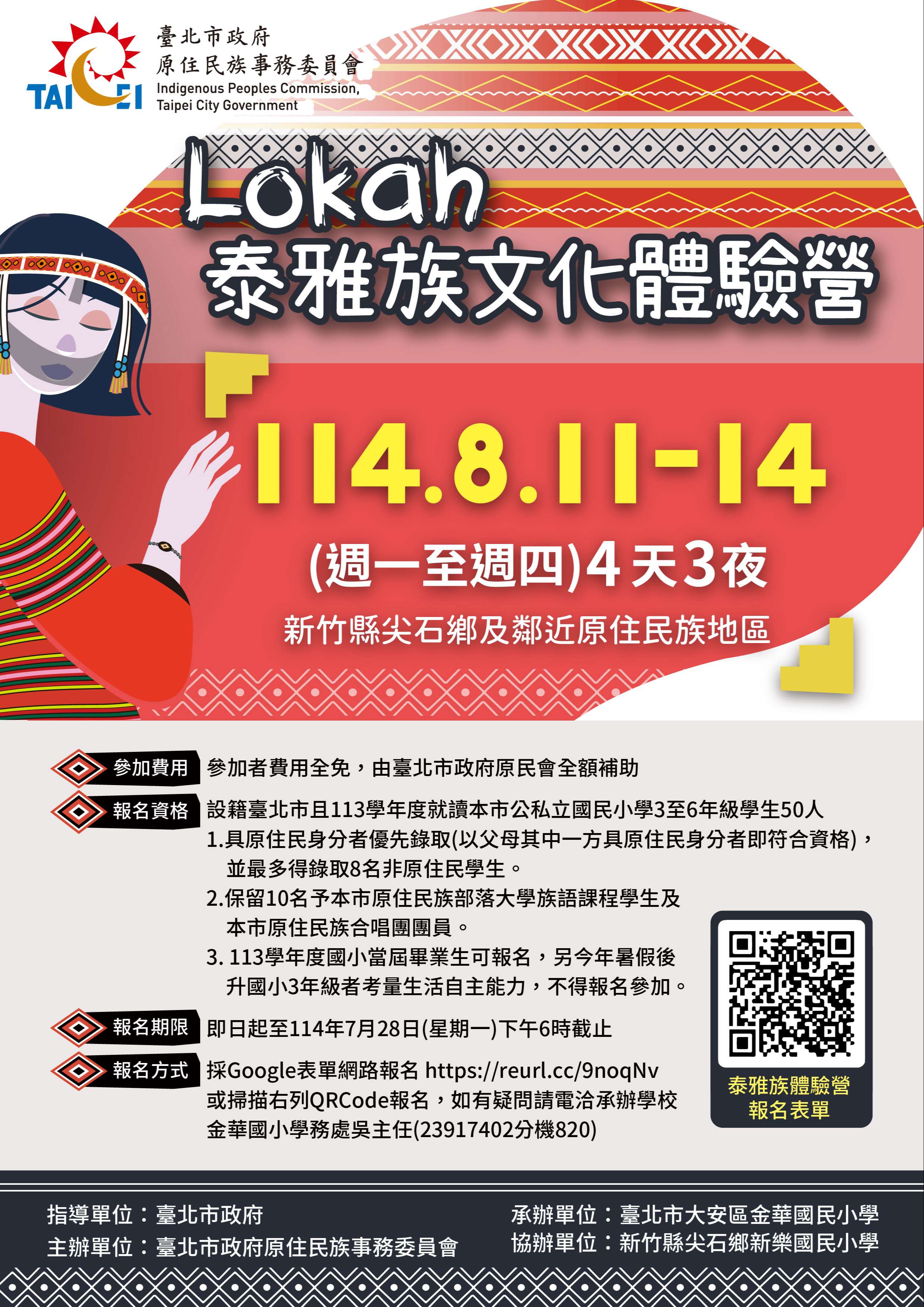 (六)參加人數及對象: 1、報名資格: (1)設籍臺北市且113學年度就讀本市公私立國民小學3 至6年級學生50人。 (2)具原住民身分者優先錄取(以父母其中一方具原住 民身分者即符合資格),並最多得錄取8名非原住 民學生。 2、保留10名予本市原住民族部落大學族語課程學生及本 市原住民族合唱團團員。