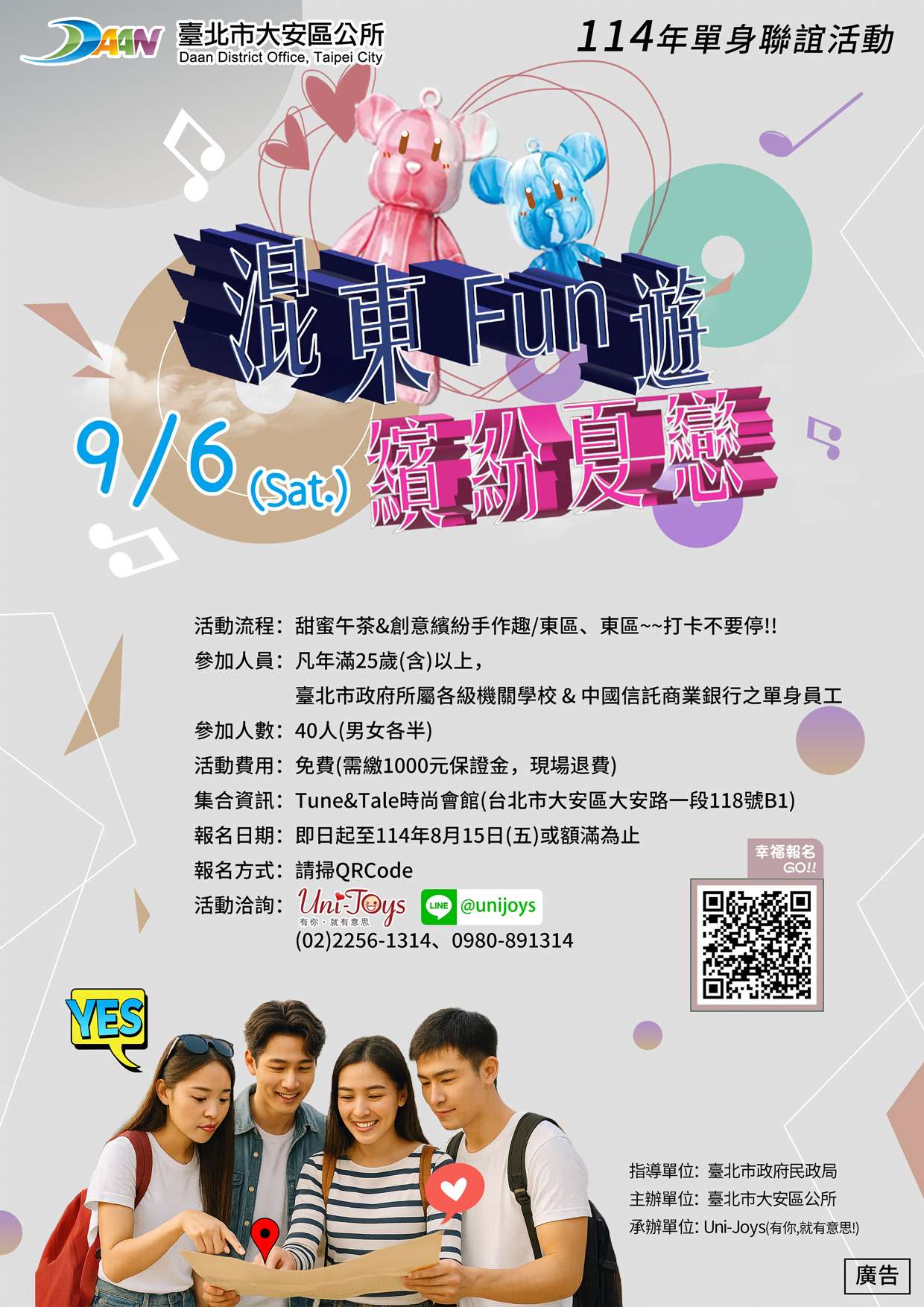 一、旨揭活動訂於114年9月6日(星期六)下午13時至17時30分 於Tune&Tale時尚會館(臺北市大安區大安路1段118號地下 1樓)及臺北東區商圈舉行,自即日起至114年8月15日(星 期五)或額滿為止。