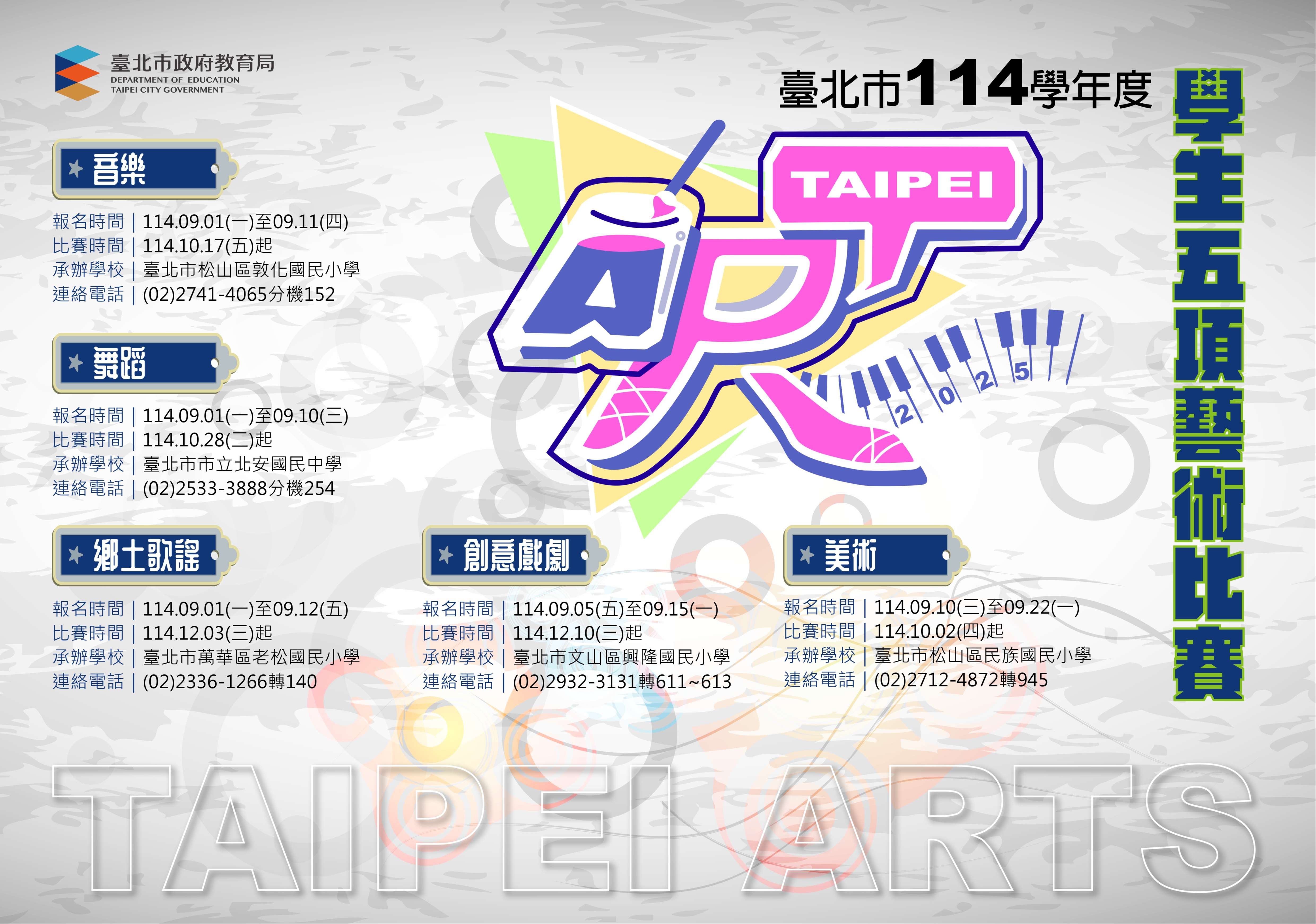 三、外僑、台商子弟、高中職無與學校合作之非學校型態實驗教育學生,以及大專院校學生之個人項目報名,以註冊報名方式登入系統進行操作。 六、檢附本市114學年度學生五項藝術比賽時程表1份及海報2 份。