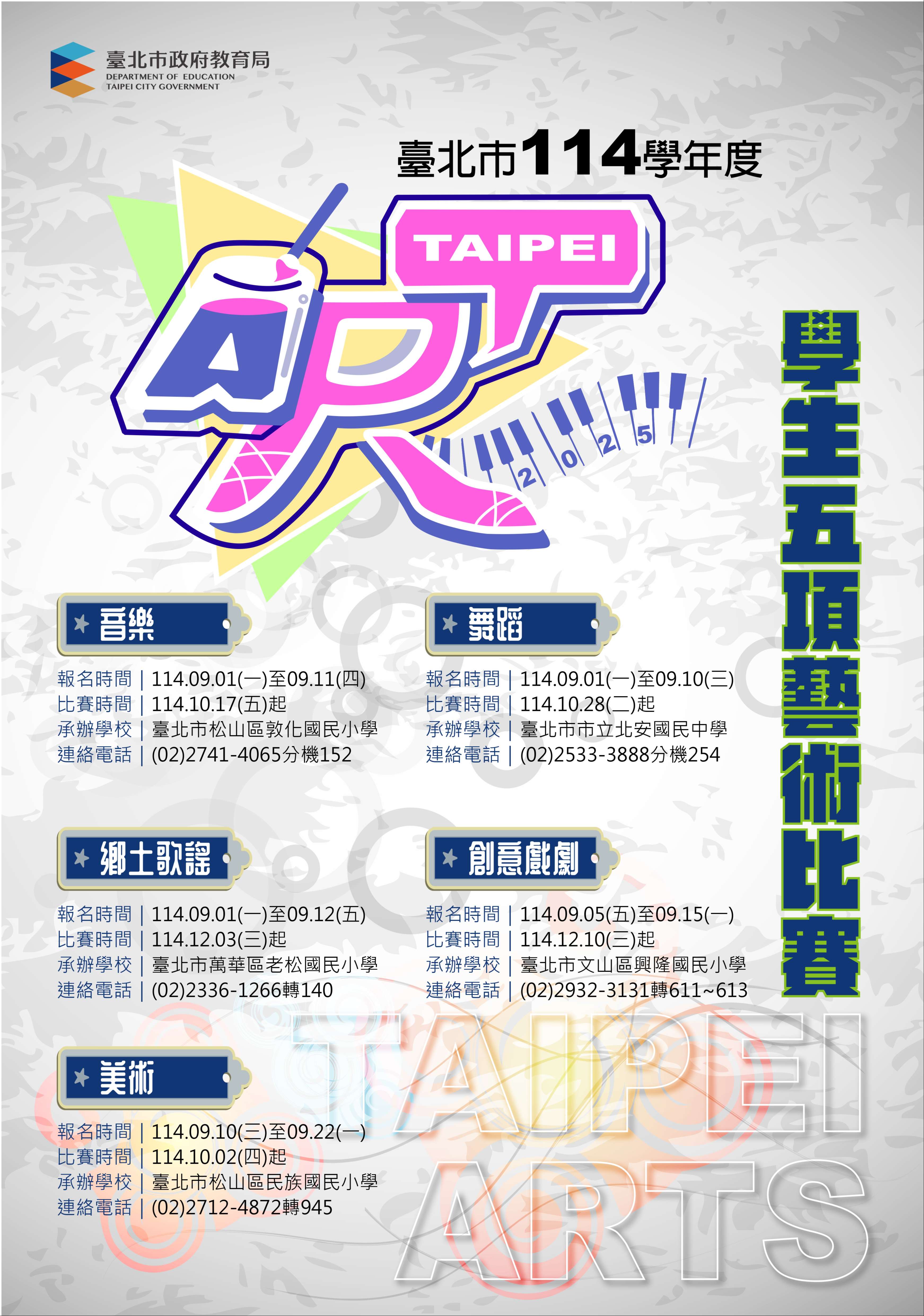 一、臺北市學生五項藝術(音樂、美術、舞蹈、創 意戲劇及鄉土歌謠)比賽,9/1起陸續開放網路報名。相關訊息及作業時程,請至臺北市五項藝術比賽網站查詢,逾期不受理。