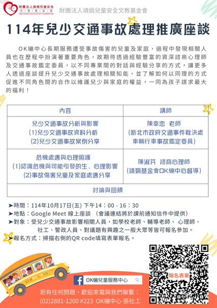 靖娟基金會OK繃兒童服務中心將於114年10月17日14時至16 時30分辦理兒少交通事故處理推廣線上座談