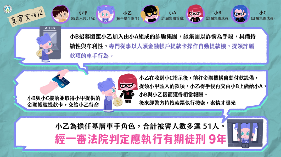 二、近年來學生擔任車手涉詐欺案件數攀升,尤以12至23歲涉案最多,教育部藉由真實案例,解析學生擔任詐騙車手所可能承擔的法律責任,製作本案懶人包,避免學生遭不法分子利用,衍生後續的法律風險與責任。