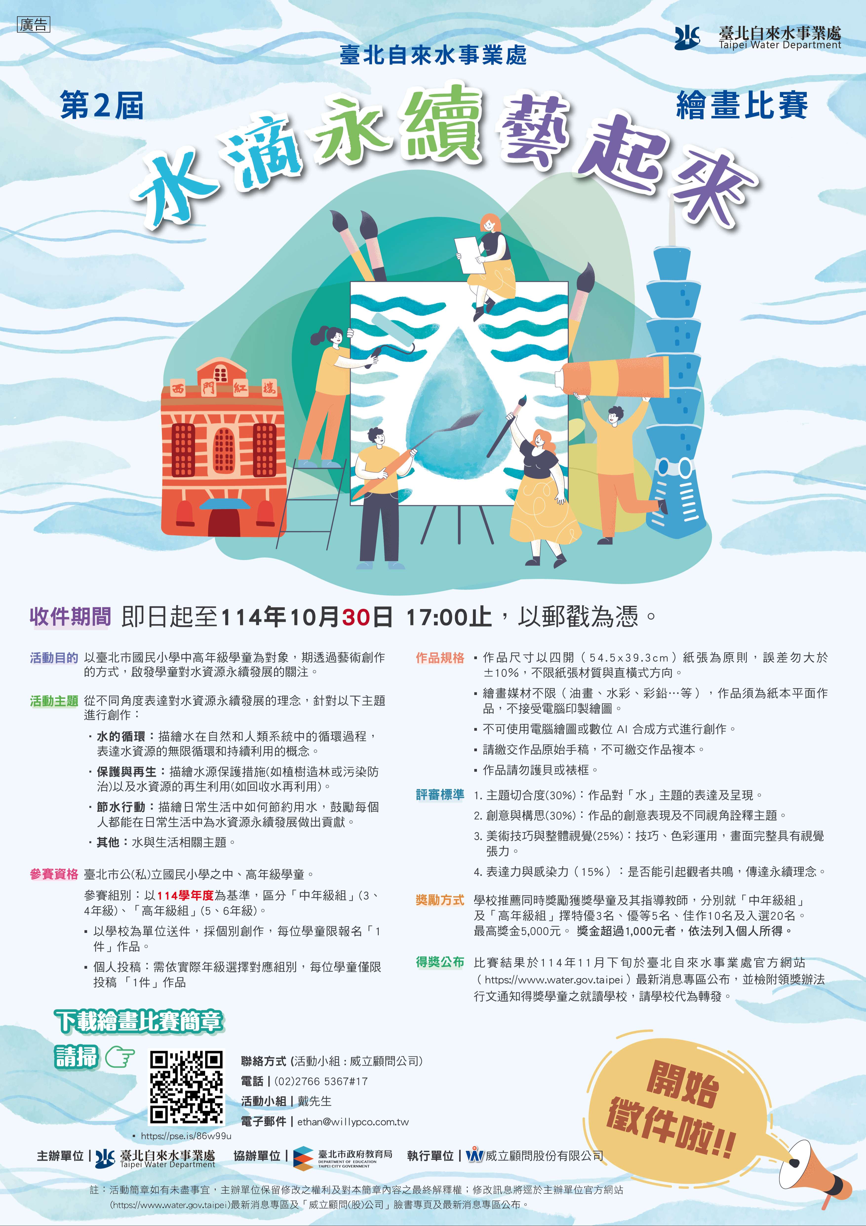 六、檢送114年第2屆「水滴永續藝起來」繪畫比賽簡章(修正版)及海報各1份(如附件)。