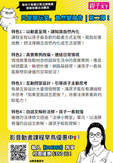 一、為推動校園法治教育向下扎根,親子天下打造《只是開玩 笑,竟然變被告?》系列影音動畫課程,並由少年調查保護官吉靜如監製。