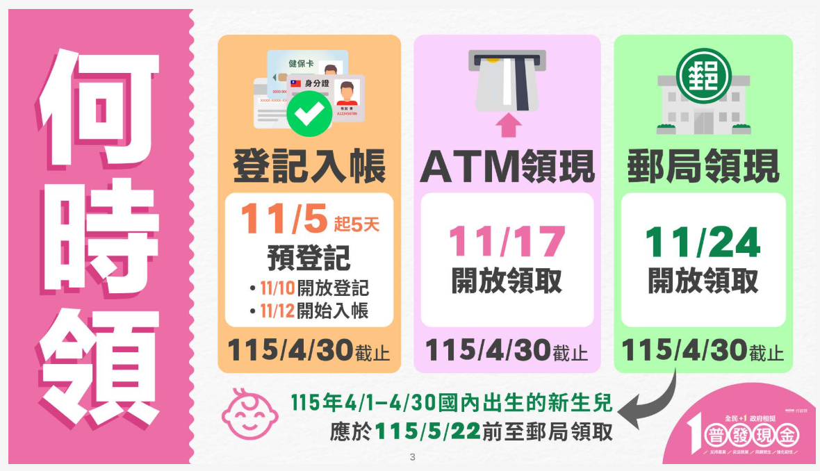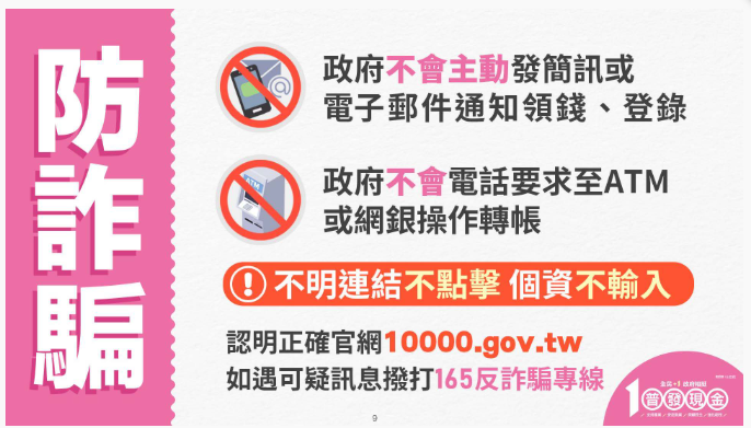 財政部「全民+1 政府相挺」普發現金網站已經上線(網 址:https://10000.gov.tw/),請呼籲教職員工生及家長採用官網的「登記入帳」方式,快速安全又方便。另,政府「不會」主動發簡訊或電子郵件通知領錢或登錄,也 「不會」電話要求到ATM或網銀操作轉帳;如遇可疑網站或訊息,請立即撥打165反詐騙專線。