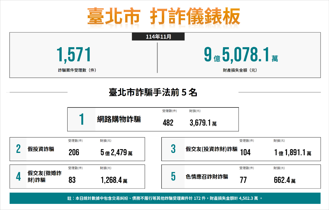 二、經分析本市114年11月各類詐欺案件發生數共計1,571件,財損金額新臺幣(以下同)9億5,078.1萬元,前3大高發詐欺手法受理件數及財損金額: (一)網路購物詐騙482件,財損3,679.1萬元。 (二)假投資詐騙206件,財損5億2,479萬元。 (三)假交友(投資詐財)詐騙104件,財損1億1,891.1萬 元。