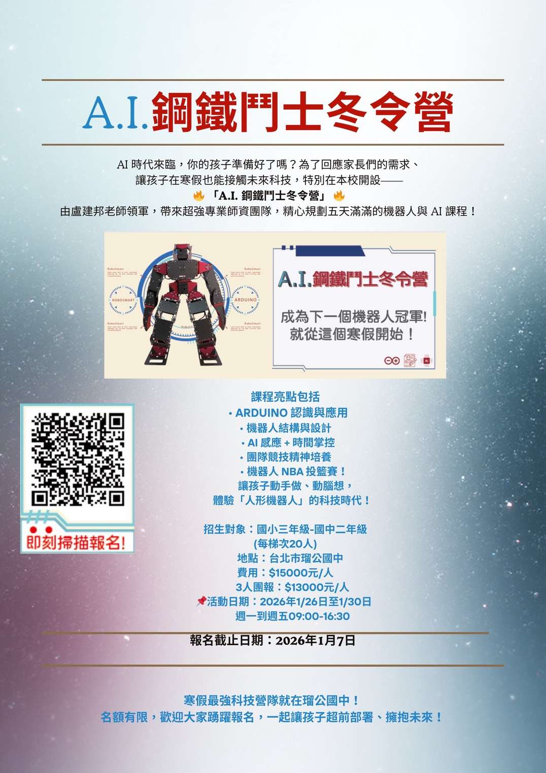 一、本校與瑠公國中家長會、威運科技、機盛科技辦理「AI鋼 鐵鬥士冬令營」,詳細課程資訊如附件。