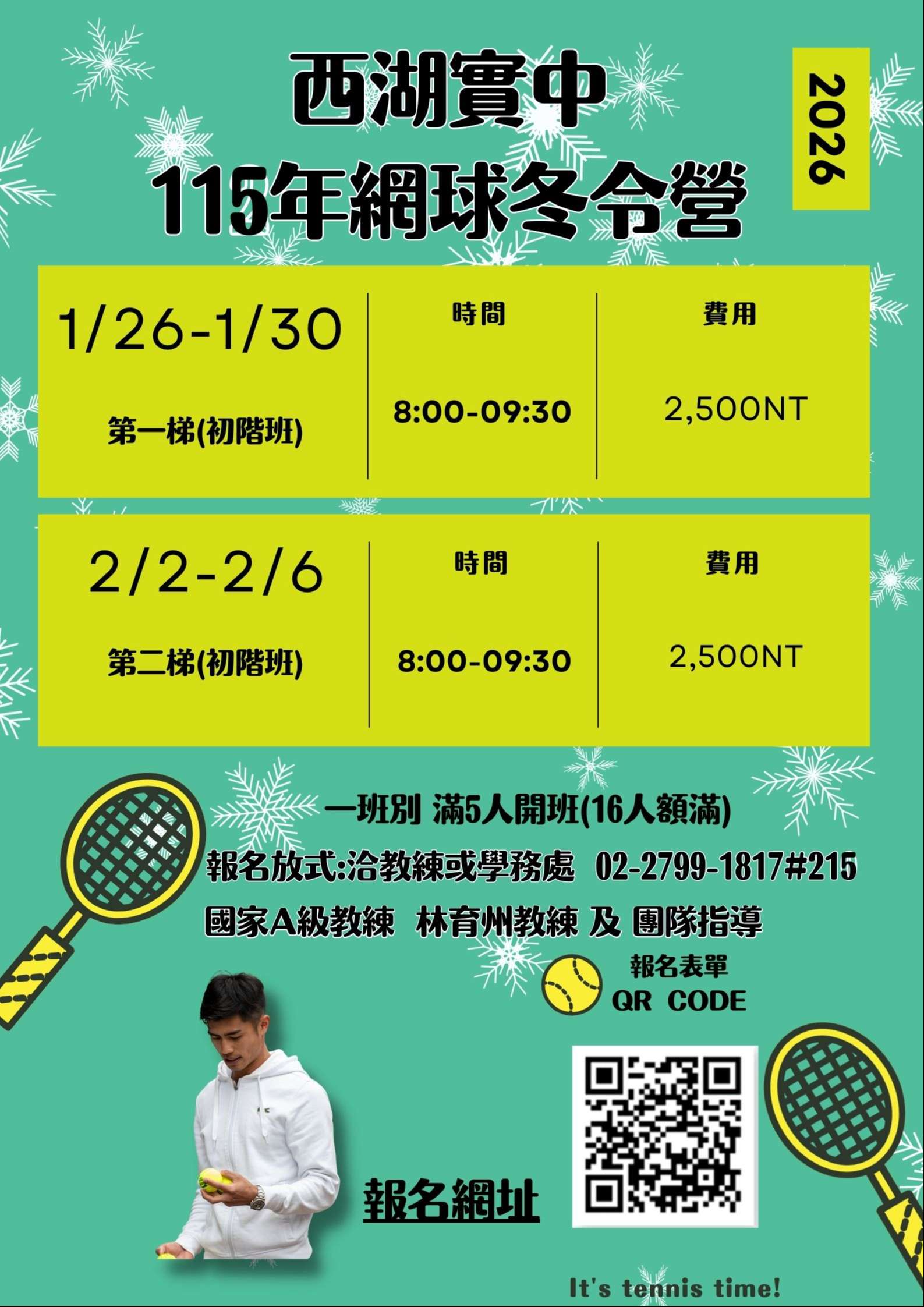 二、檢附本校115年度網球冬令營活動實施計畫暨報名表1份以 及活動海報。