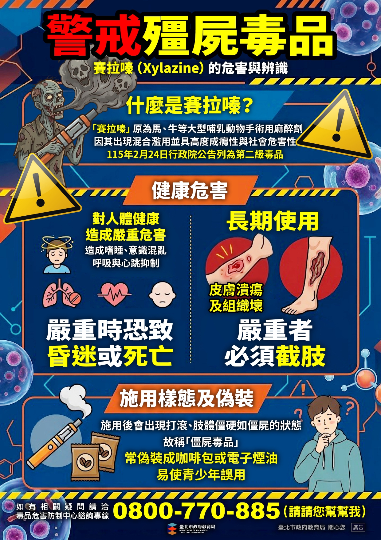 依行政院115年2月24日正式公告,將賽拉嗪(Xylazine) 列為第二級毒品(行政院公報:https://gazette.nat. gov.tw/egFront/eguploadpubWrapper? metaid=163724&file=/EG_FileManager/eguploadpub /eg032031/ch01/type1/gov01/num1/Eg.htm)。