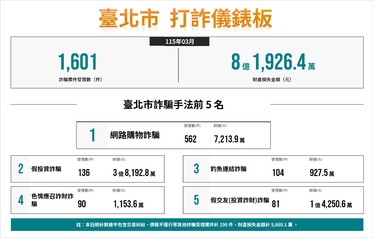 二、經分析本市115年3月各類詐欺案件受理數共計1,601件,財 損金額新臺幣(以下同)8億1,926.4萬元,前3大高發詐欺 手法受理件數及財損金額: (一)網路購物詐騙562件,財損7,213.9萬元。 (二)假投資詐騙136件,財損3億8,192.8萬元。 (三)釣魚連結詐騙104件,財損927.5萬元。