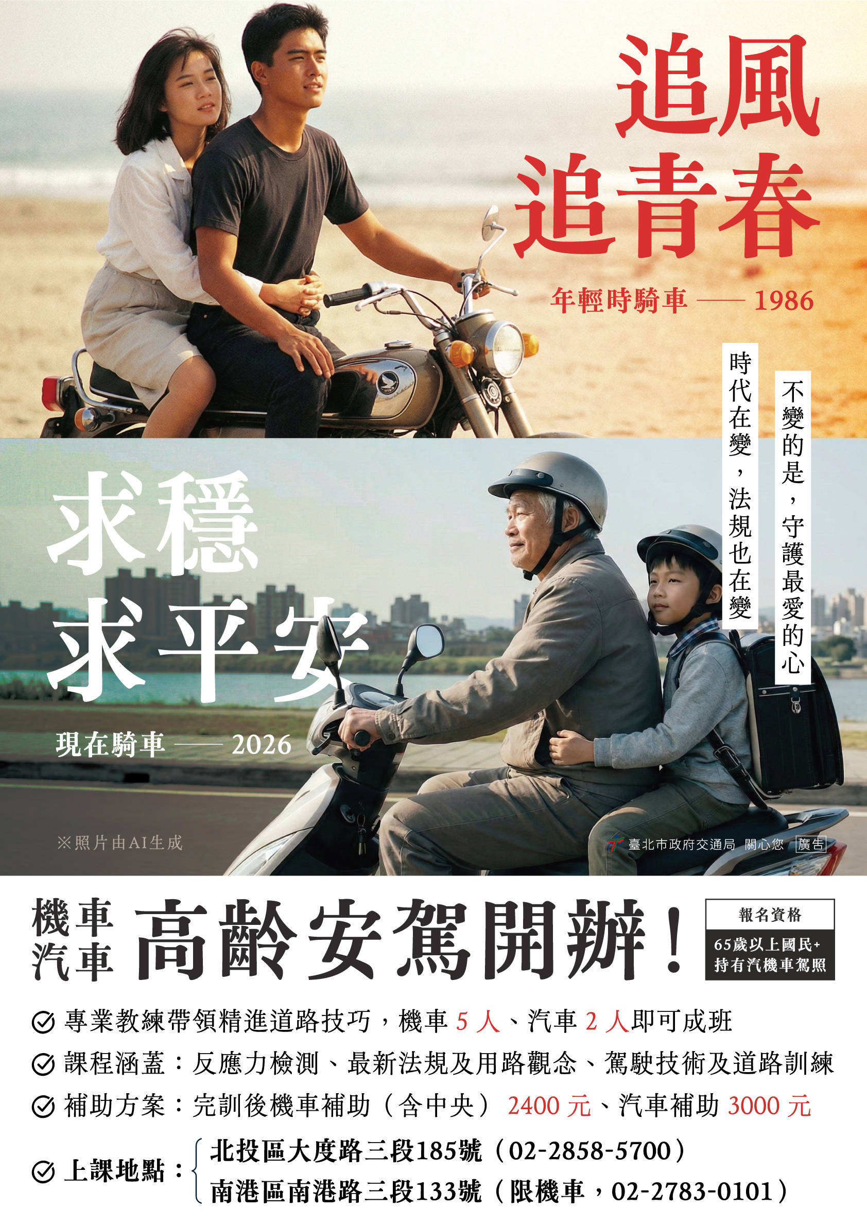 高齡駕訓開班中,詳情請至 北市交通局官網車輛駕訓補助專區查詢!